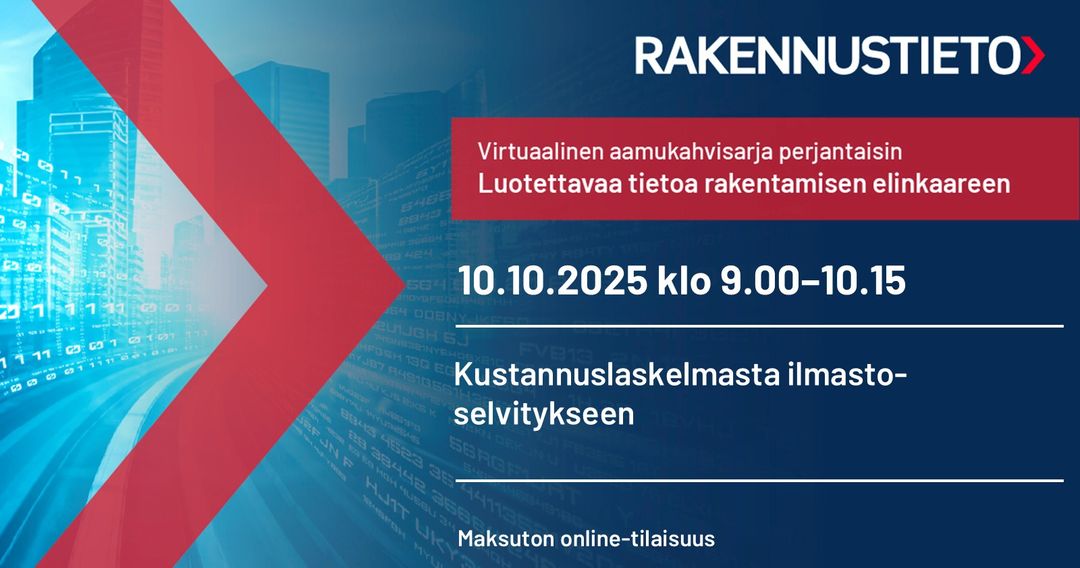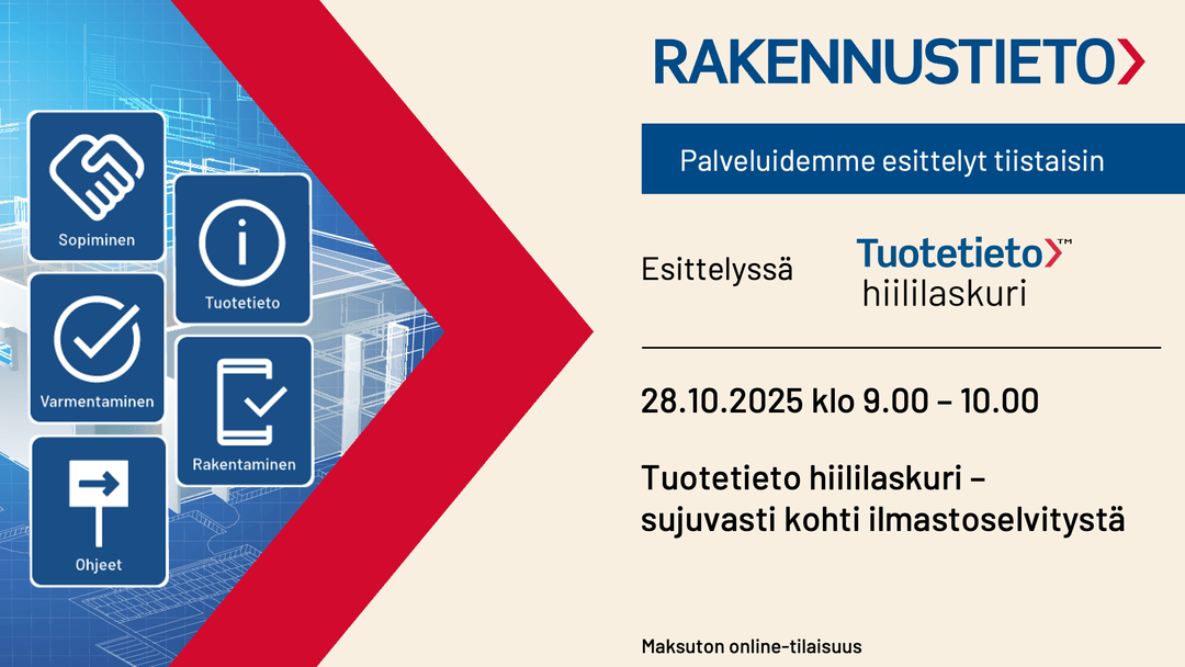 Aika: 28.10.2025 klo 9.00-10.00TeamsIlmoittaudu tästä Rakennustieto on rakentanut asiakkaiden tarpeita kuunnellen hiilijalanjäljen laskentatyökalun, Tuotetieto hiililaskurin. Hiililaskurin avulla on mahdollista laskea rakentamislain ilmastoselvitysasetuksen mukaiset hiilijalanjälki ja hiilikädenjälki. Lisäksi sillä voi laatia rakennuksen materiaaliselosteen ja rakennustuoteluettelon. Hiililaskuri tuottaa rakentamislain vaatimat dokumentit muun muassa rakennuslupahakemusta varten. Tuotetieto hiililaskuri on tehty markkinoiden edullisimmaksi ja helppokäyttöisimmäksi täyden palvelun työkaluksi. Hiililaskurissa … Lue lisää