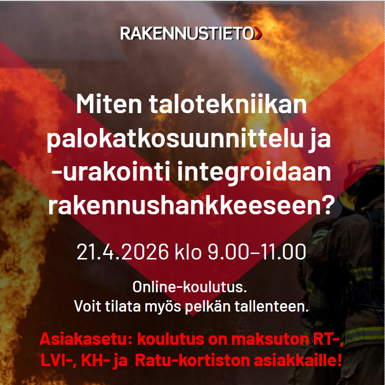 Rakennustietosäätiö RTS pyytää lausuntoja LVI-tekniikan palo-osastoimattomia läpivientejä käsittelevästä ohje-ehdotuksesta. Ohjeessa on esitetty lämmitys-, jäähdytys-, käyttövesi- ja viemäriputkistojen sekä ilmanvaihtokanavien läpivientien toteutustapoja erilaisten rakenteiden yhteydessä. Ohjeita voidaan soveltuvin osin käyttää myös muiden putkistojen läpivientien toteutuksessa. Ohjekorttiehdotus on päivitys ohjekorttiin LVI 12-10217 Putkien läpiviennit. Ohjekortin päivityksessä ei käsitellä palo-osastoituja läpivientejä eikä niihin liittyviä palokatkoja. Lausuntoaineisto alla. Lausuntojen … Lue lisää