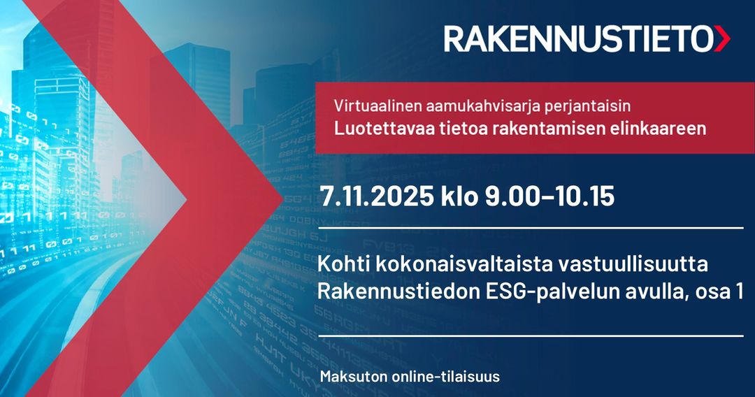 Aamukahvilla kerromme keväällä 2026 lanseerattavan ESG-palvelun kehitystyöstä ja tarjoilemme välähdyksiä vastuullisuuden eri osa-aiheiden kriteereistä sekä palvelun kytkeytymisestä Rakennustiedon laajan palveluvalikoiman tarjoamaan tietoon.